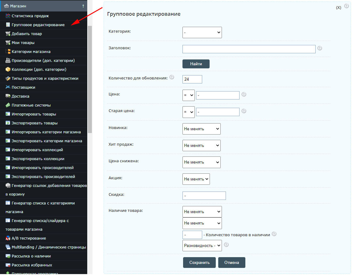 Updated «Group Editor». Added the ability to change the «Price», «Old price», «Specify shares» (including the timer), as well as search by «Title» and «Category».