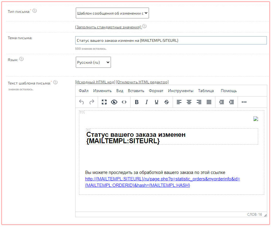 Added an editable email template about changing the status of an order.