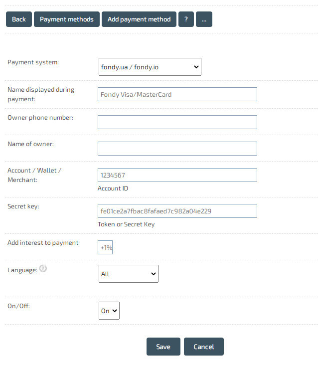 Select "Fondy.ua / Fondy.io" and fill in the received `Merchant ID` - Account, and `Payment key` - Secret key.