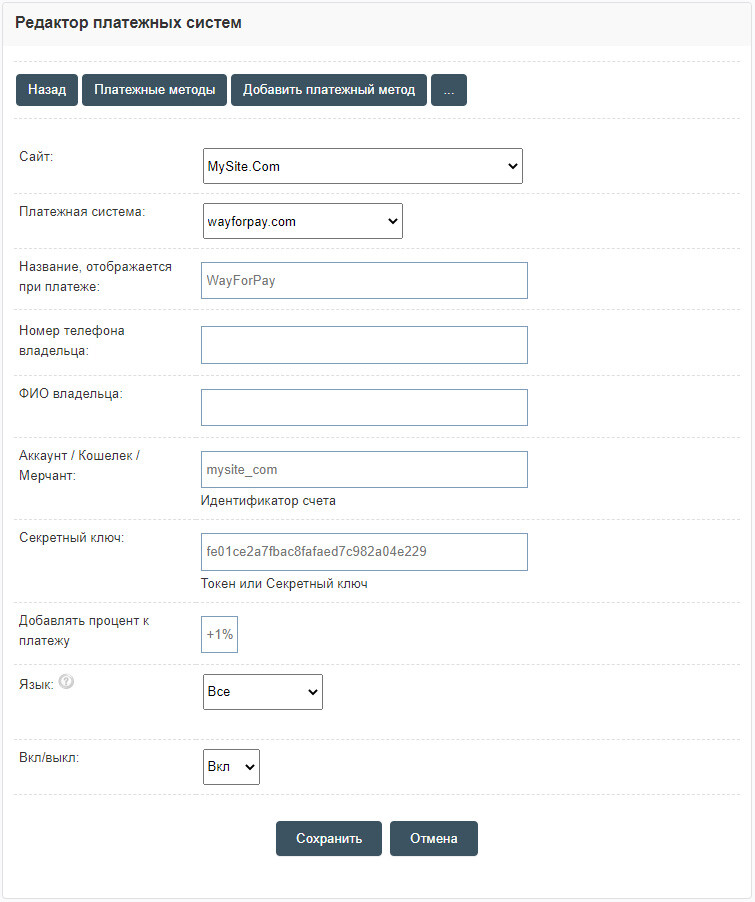 Wybierz «Wayforpay.com» i wypełnij otrzymał ` MERCHANT LOGIN` - konto i `MERCHANT SECRET KEY` - tajny klucz.
