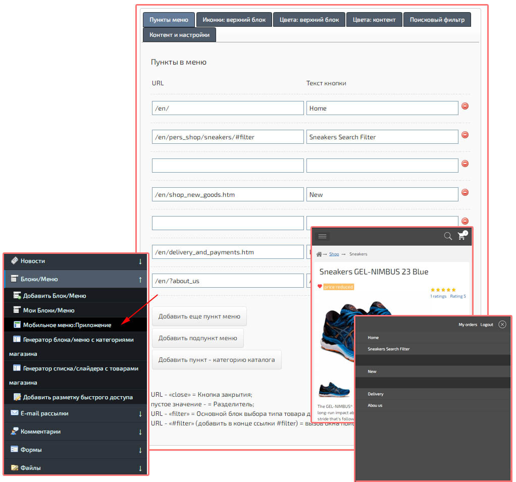 Dodano konstruktor menu mobilnego. Konstruktor umożliwia tworzenie wielopoziomowych menu, określanie wyświetlanych ikon, kolorów elementów, a także wyskakujący filtr wyszukiwania dla różnych rodzajów produktów.