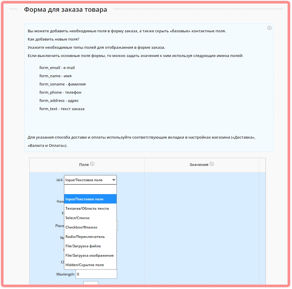 Dodano zaawansowany edytor pól dla Formularza Zamówienia. Możesz utworzyć do 50 pól z różnymi typami danych (pola tekstowe, łańcuchy, przesyłanie plików, chachkbox i wybrane elementy). Kontrola formularza znajduje się w ustawieniach, w zakładce «Sklep», «Zamówienie».