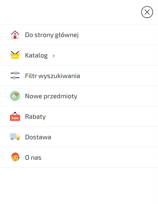 Możesz tworzyć elementy i podmenu, dodawać własne i funkcjonalne ikony (wyszukiwanie, koszyk, porównanie produktów, logowanie, kategorie, producenci, filtry i wiele innych). Design i układ menu są łatwe do dostosowania, a aktywację można przypisać nie tylko do wbudowanego przycisku, ale do dowolnego elementu strony.