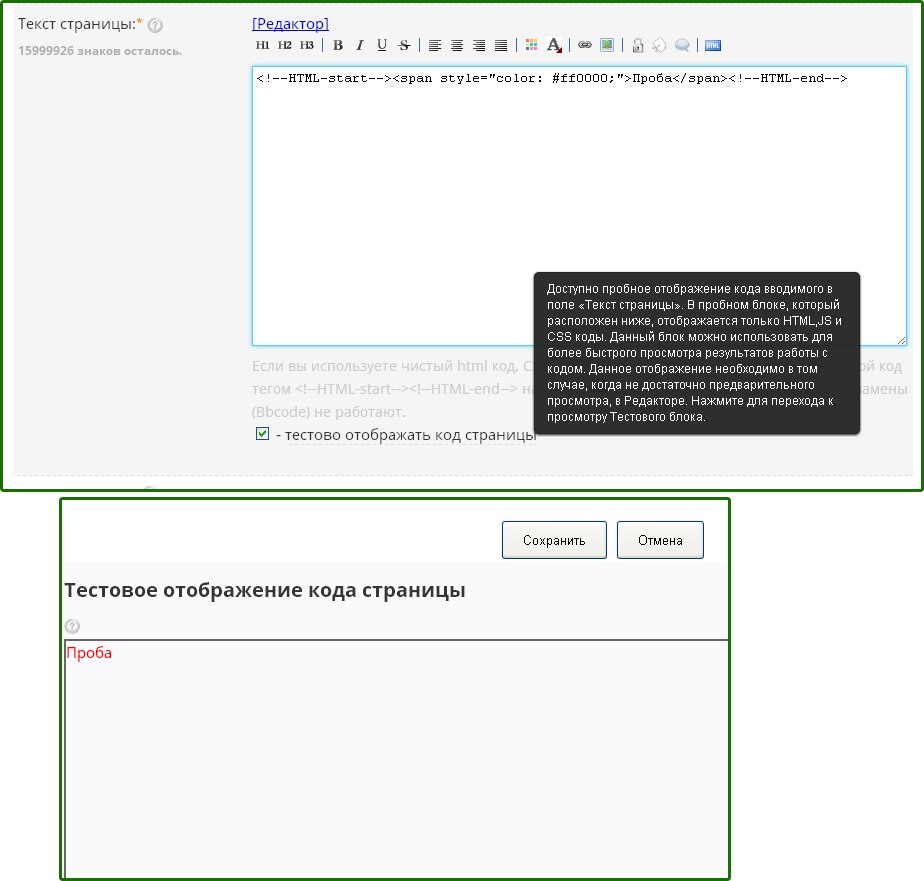 Добавлено тестовое отображение результата кода Страницы.