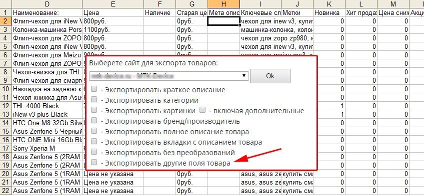Добавлена возможность экспорта дополнительных полей, таких как: Мета описание, Ключевые слова, Метки, Акции, Новинки, Хиты продаж, Акционный текст, старая цена и другие данные.