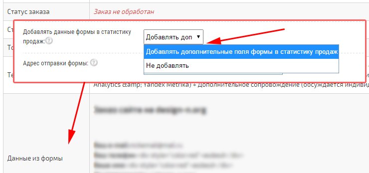 Добавлена отправка данных конструктора форм в статистику продаж. Ранее в статистку продаж можно было отправлять список товаров и контактные данные заказчика. Данная функция расширена и теперь можно отправлять и прочие данные заполненные в форме. Данные будут отображены в дополнительном поле, в статистике продаж.