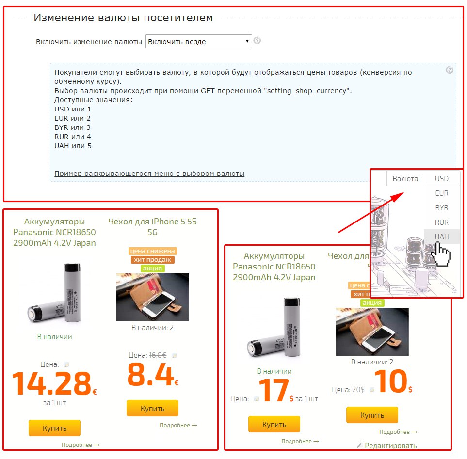 Добавлена возможность менять основную валюту сайта, с конверсией по внутреннему (или настраиваемому) курсу. Функция настраивается во вкладке Магазин.