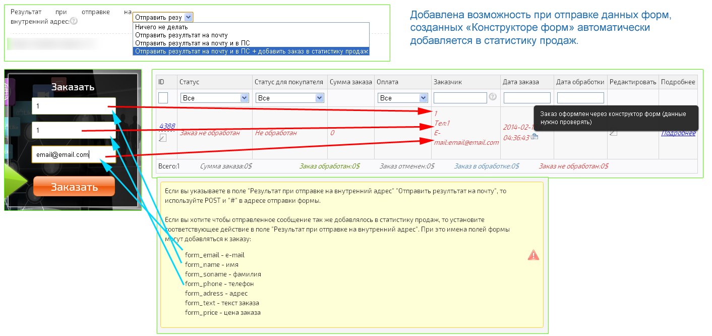 Добавлена возможность отправлять заказы через форму созданную на конструкторе форм, в статистику продаж. Так же в заказе можно сразу установить данные о цене, покупателе, и текст заказа. Данную форму так же теперь удобно использовать для A/B тестинга, достаточно указать form_title, не создавая дополнительных копий форм. Информацию об этом вы можете найти на странице конструктора форм.