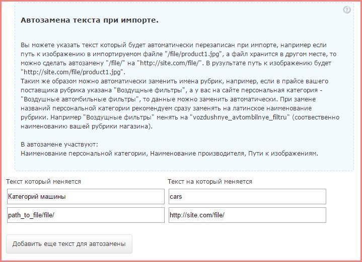Вы можете указать текст который будет автоматически перезаписан при импорте, например если путь к изображению в импортируемом файле "/file/product1.jpg", а файл хранится в другом месте, то можно сделать автозамену "/file/" на "http://site.com/file/". В рузультате путь к изображению будет "http://site.com/file/product1.jpg".