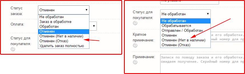 Добавлены уточнения в статусы заказов. "Отменен (Нет в наличии)", а так же "Отменен (Отказ)"