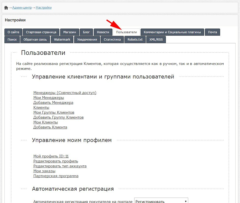 Отделено управление Автоматической регистрации пользователей на сайтах.