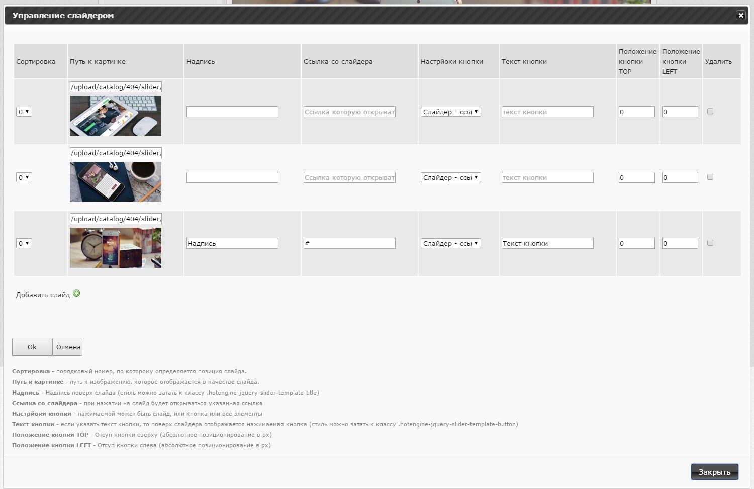 Добавлено управление слайдером. Можно управлять (в том числе и загружать) изображения. Указывать ссылку которую открывать при нажатии на слайд или кнопку. Заголовок слайда и текст кнопки. Устанавливать положение Кнопки. Слайд создается в разделе "Мои Блоки/Меню".