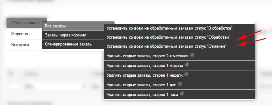 Добавлена массовая установка статуса "Отменен" и "Обработан" для не обработанных и не оплаченных заказов в статистике продаж.