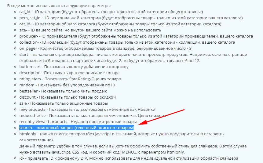 Добавлен новый параметр "search-" в генератор слайдера/списка товаров. Данный параметр поможет отобразить товары как при поисковом запросе.