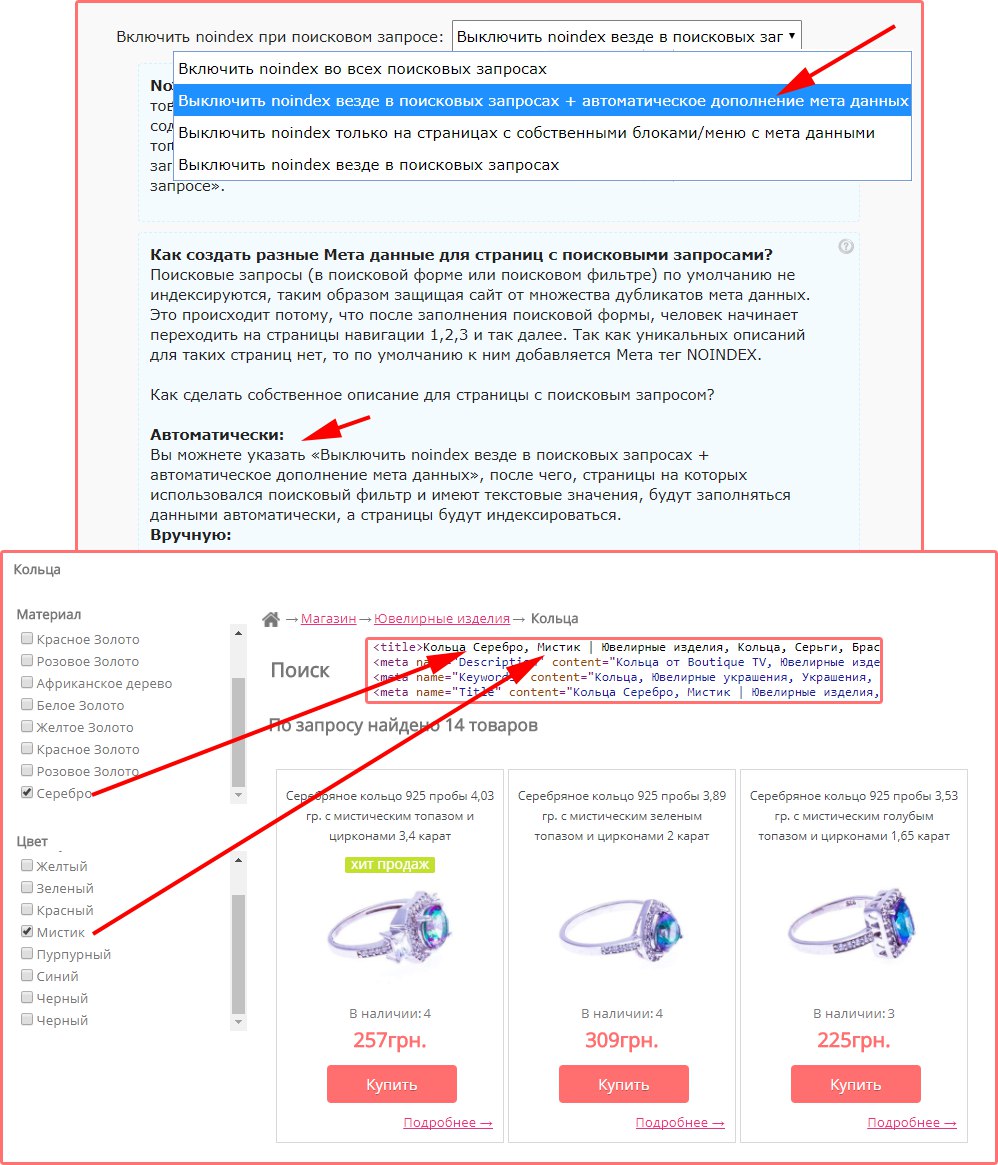 Добавлена возможность автоматически создавать мета данные при использовании запросов в поисковом фильтре. Когда посетитель выбирает поисковые параметры, то в мета данных будут добавлены соответствующие выбранные в фильтре слова.