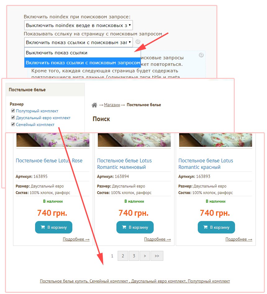 При использовании поискового фильтра, если товар найден, то будет отображаться ссылка, которая позволит индексировать страницу с поисковым запросом. Данную ссылку можно Включить или Выключить.