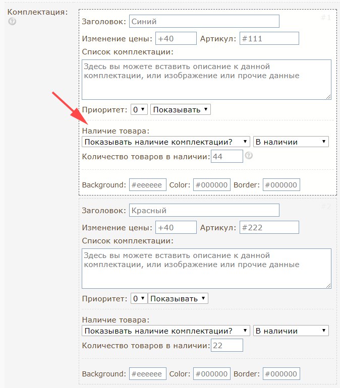 Добавлено наличие товара в Комплектацию. Кроме цены, артикула и описания комплектации, теперь можно указать количество товара данной комплектации.
