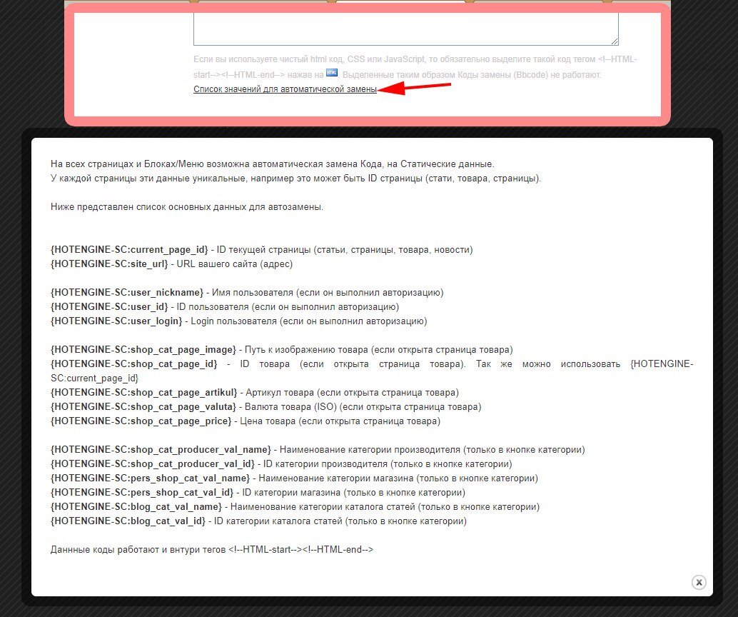 Обновлена инструкция по работе с SHORTCODES. Данные коды делают автозамену контента, например, если вам надо в тексте указать Имя посетителя, или ID товара, то данный код вам поможет.