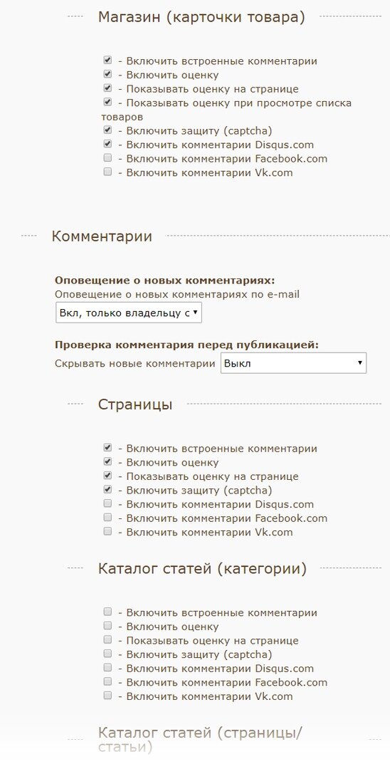 Добавлены расширенные настройки для Комментариев и Отзывов. Для каждого типа страницы можно указать способы комментирования индивидуально.