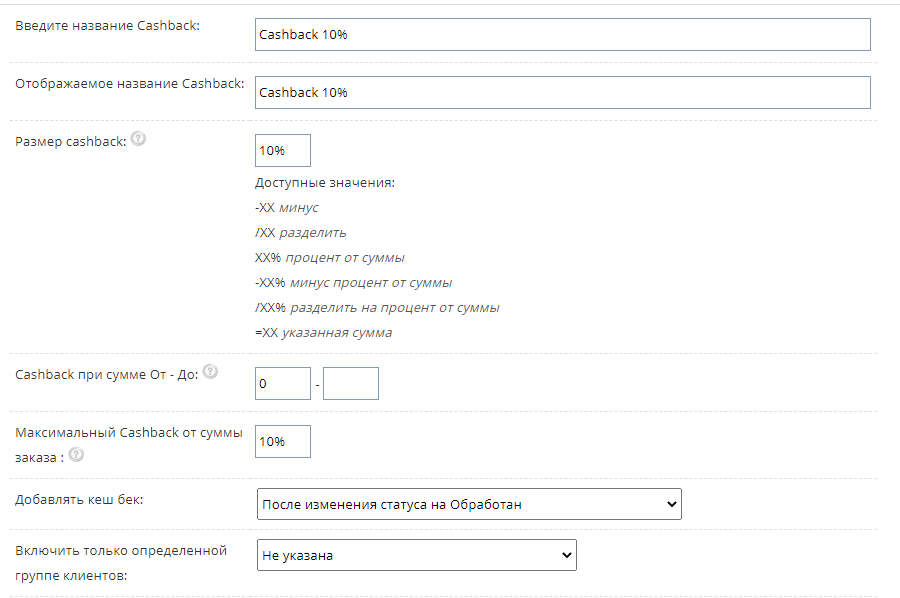 Добавлена функция "Cashback".