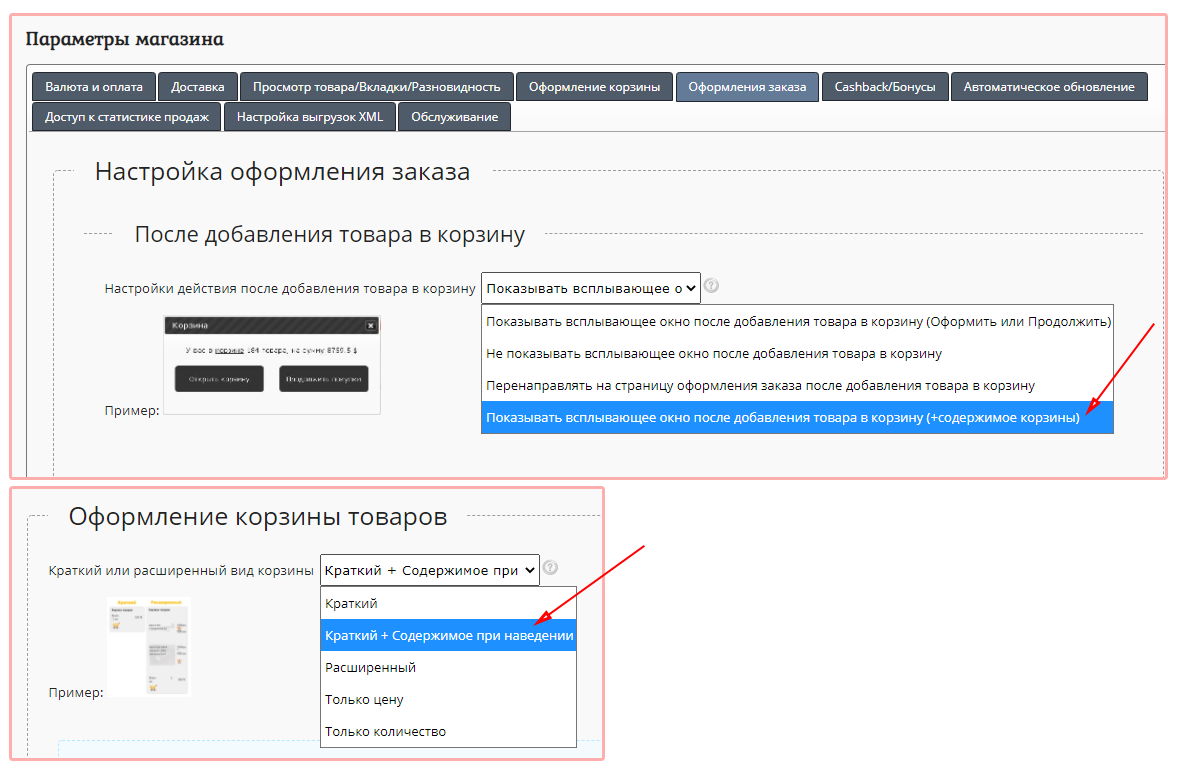 Добавлена настройка отображения содержимого корзины после добавления товара в корзину или при наведении курсора мыши.