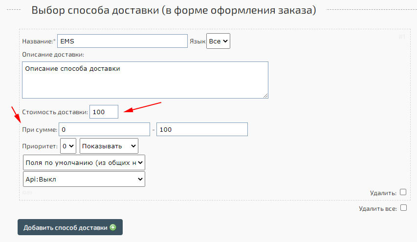 Обновлен редактор выбора способов доставки в форме оформления заказа. Добавлена возможность дополнительно указать фиксированную стоимость доставки. Добавлена возможность использовать условия для отображения способа доставки в зависимости от суммы заказа.