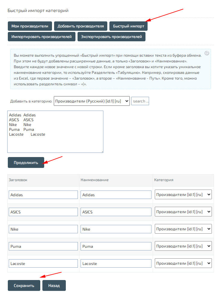 Добавлен «Быстрый импорт» производителей. Список производителей с «Заголовком» и латинским «Наименованием» можно скопировать из буфера обмена, например из «Excel».