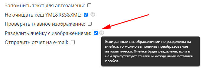 Если данные с изображениями не разделены на ячейки, то можно выполнить преобразование автоматически. Ячейка «Ссылка на изображение (основное)» будет разделена, если в ней присутствуют ссылки и между ними вставлен пробел. Если вы используете автоматическое разделение ячейки с изображениями, то не указывайте ячейки с дополнительными изображениями 1,2,3,4… Достаточно указывать только Основное изображение.