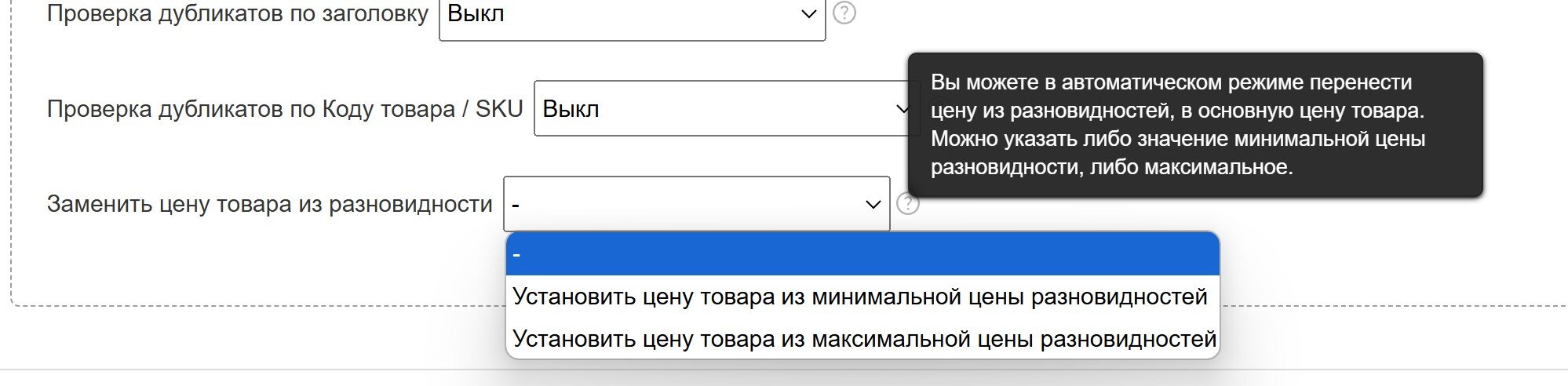 Добавлен массовый перенос цены из разновидностей в основную цену товара