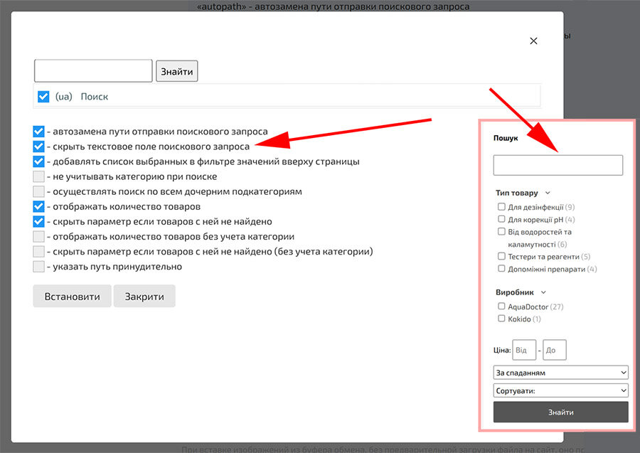 hide_inputдля скрытия текстового поля поиска. - Гибкость: Идеально подходит для страниц, где фильтрация осуществляется только через предустановленные списки или чекбоксы.