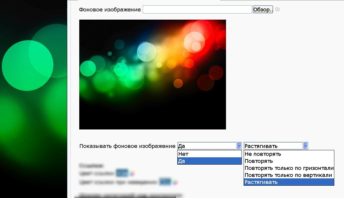 Добавлена функция автоматической установки фонового изображения для сайта. Доступны растяжка или повторение картинки...