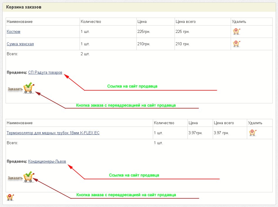 При добавлении в корзину товаров разных заказчиков, они автоматически группируются и при заказе отображаются со ссылкой на сайт продавца. Так же при переходе на сайт продавца, покупатель сможет выбрать способ доставки о прочие параметры, которые доступны только на сайте продавца.