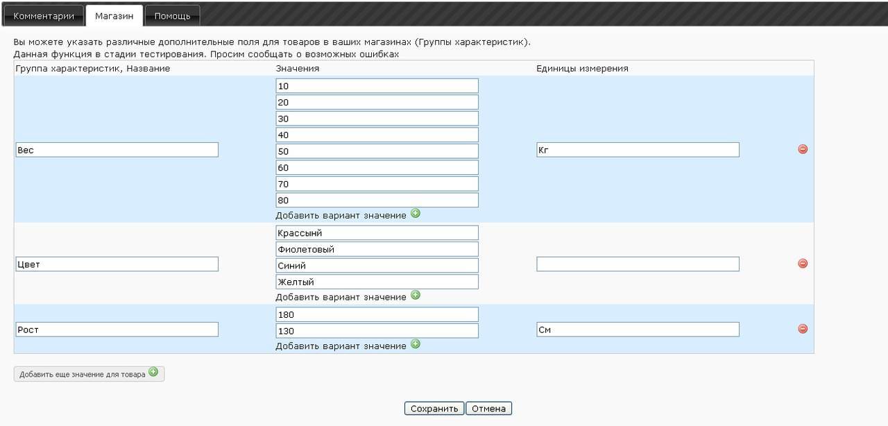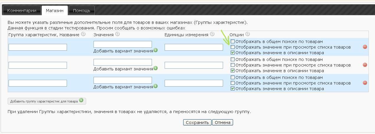 Настройки, в Админцетре, и выберите вкладку "Магазин". Создайте группу характеристик. После этого при редактировании/добавлении товара, Вы сможете указать значения из созданных групп характеристик. Группы характеристик открываются только если вы отрыли редактор товаров из Вашего домена.