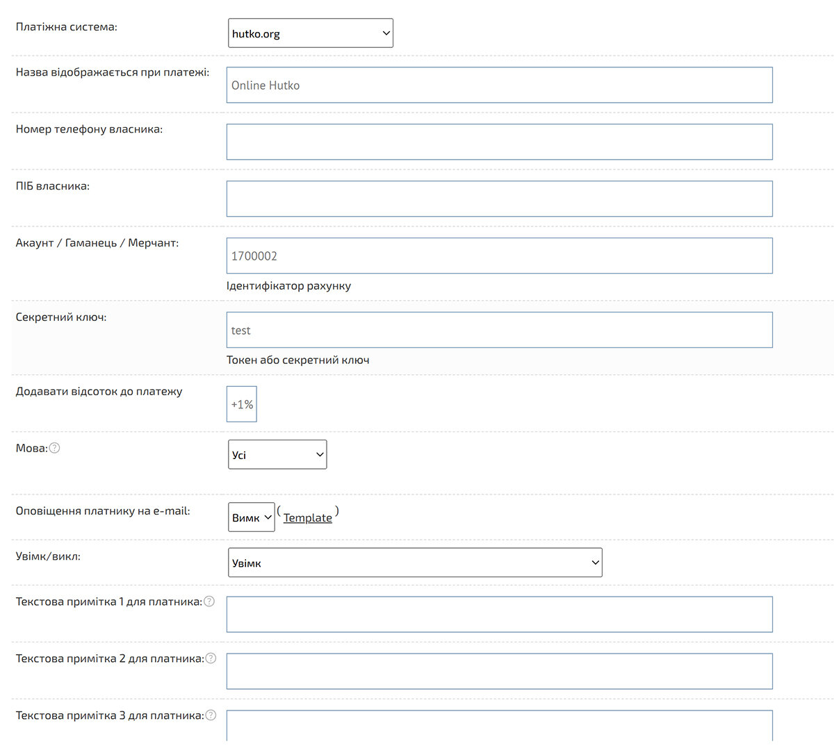 Виберіть "Hutko.org" та заповніть поля: `ID мерчанта` — Акаунт, `Ключ оплати` — Секретний ключ.