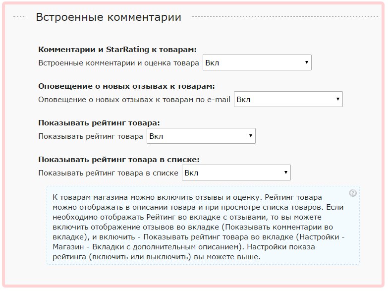 Рейтинг можна відображати як у списку товарів, так і при його окремому перегляді. Налаштування здійснюються у вкладці "Коментарі та соціальні плагіни".