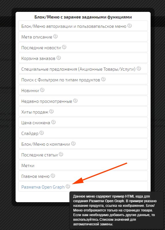 Додано функціональне меню для створення Розмітки Open Graph. Дане меню містить приклад HTML коду для створення розмітки Open Graph, в якому вказано назву продукту та посилання на його зображення. Блок/Меню відображається тільки на сторінках товару, у Мета даних. Якщо вам необхідно додати розмітку на інші сторінки або вказати інші дані, скористайтесь "Списком значень для автоматичної заміни" на сторінці створення Блоків/Меню.