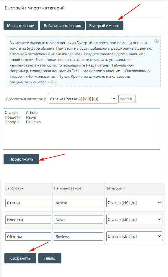 Доданий швидкий імпорт «Категорій каталогу статей».