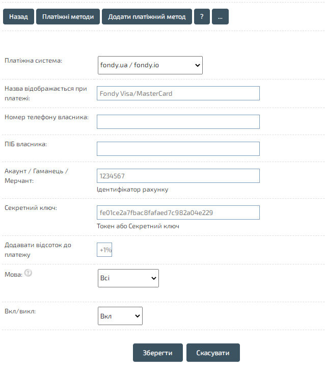 Виберіть "Fondy.ua / Fondy.io" та заповніть отриманий `ID мерчанта` - Акаунт, та `Ключ платежу` - Секретний ключ.