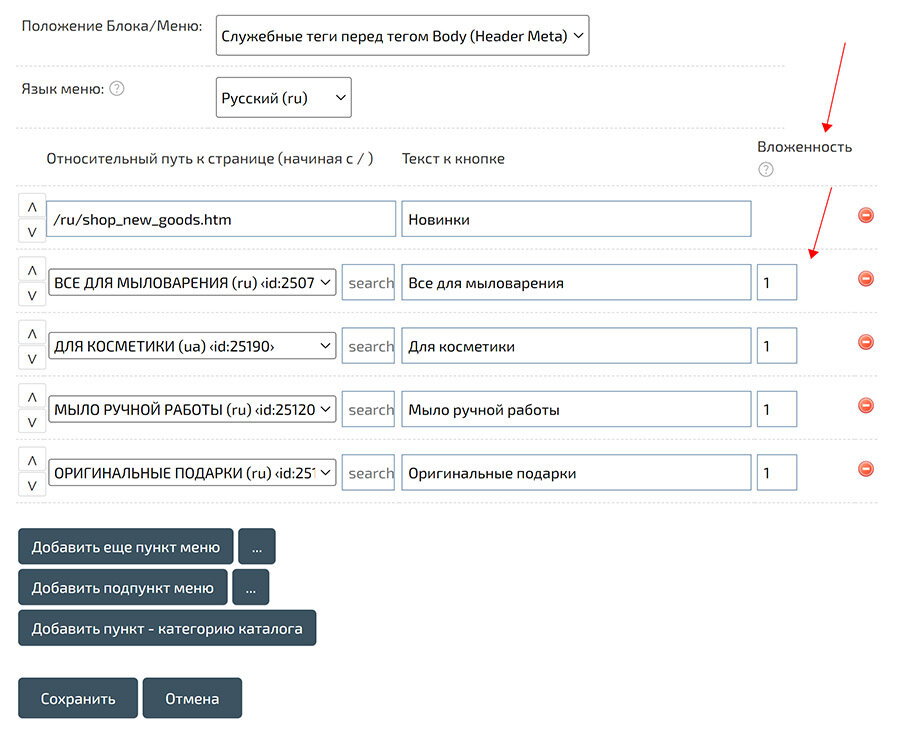 Доданий параметр "Рівень вкладень" у пунктах головного меню. Параметр дозволяє обмежити кількість вкладень, якщо пункт містить безліч підпунктів із дочірніми підкатегоріями.
