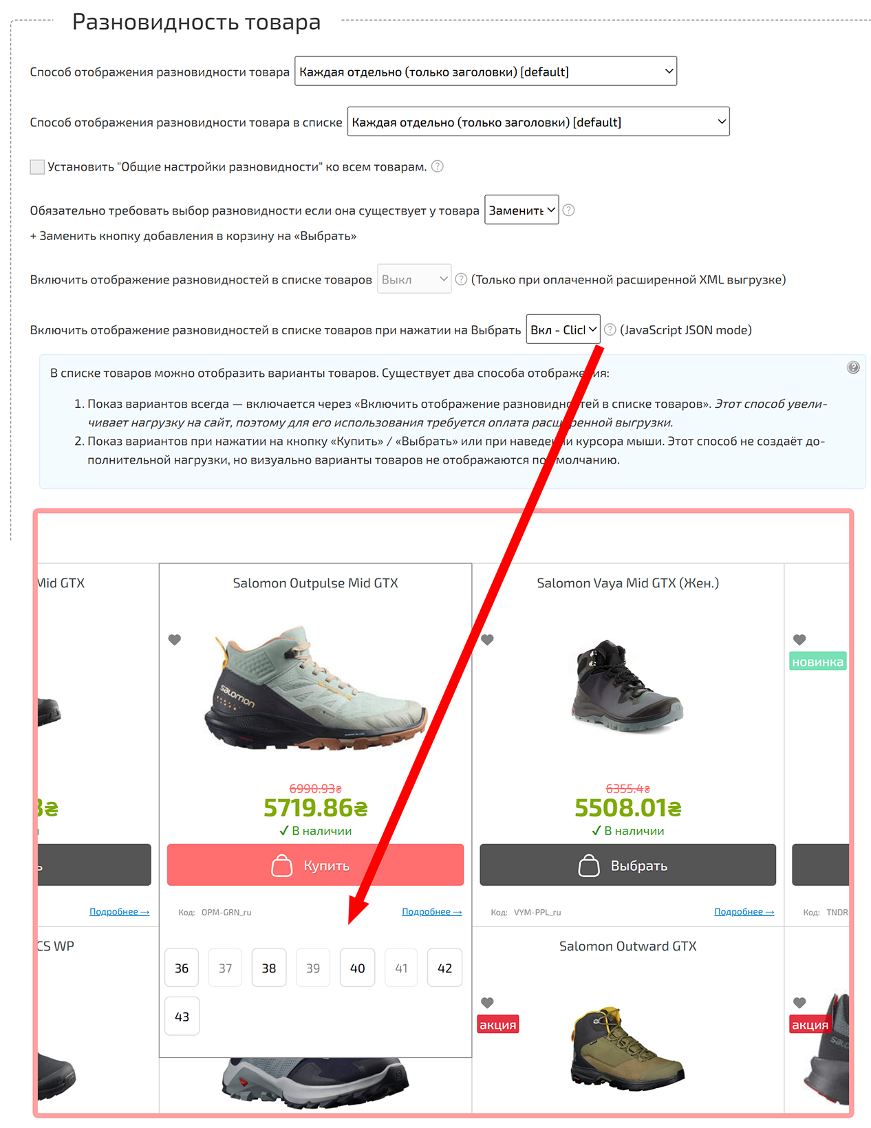 Тепер варіанти товарів можуть підвантажуватися динамічно: при натисканні кнопки «Купити» / «Обрати» або при наведенні курсора миші. Такий підхід не створює додаткового серверного навантаження та є оптимальним для більшості магазинів із великим асортиментом.