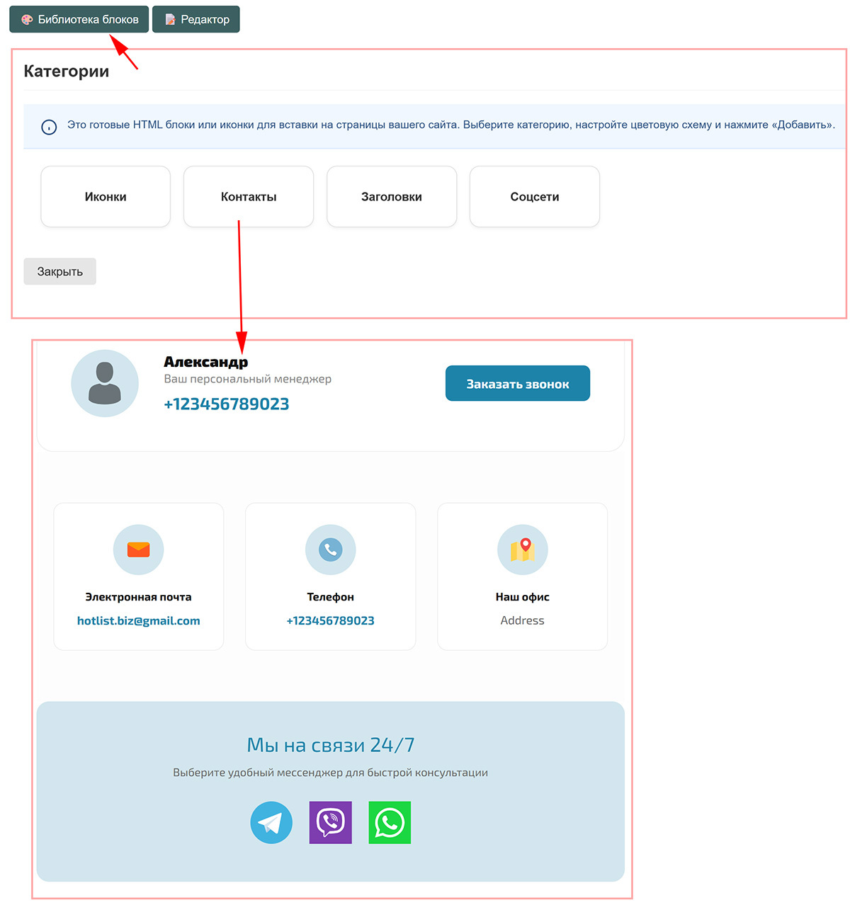 - Бібліотека готових HTML-блоків: вставляйте складні елементи верстки (лендінг-секції, текстові блоки, елементи дизайну) одним кліком без знання коду.